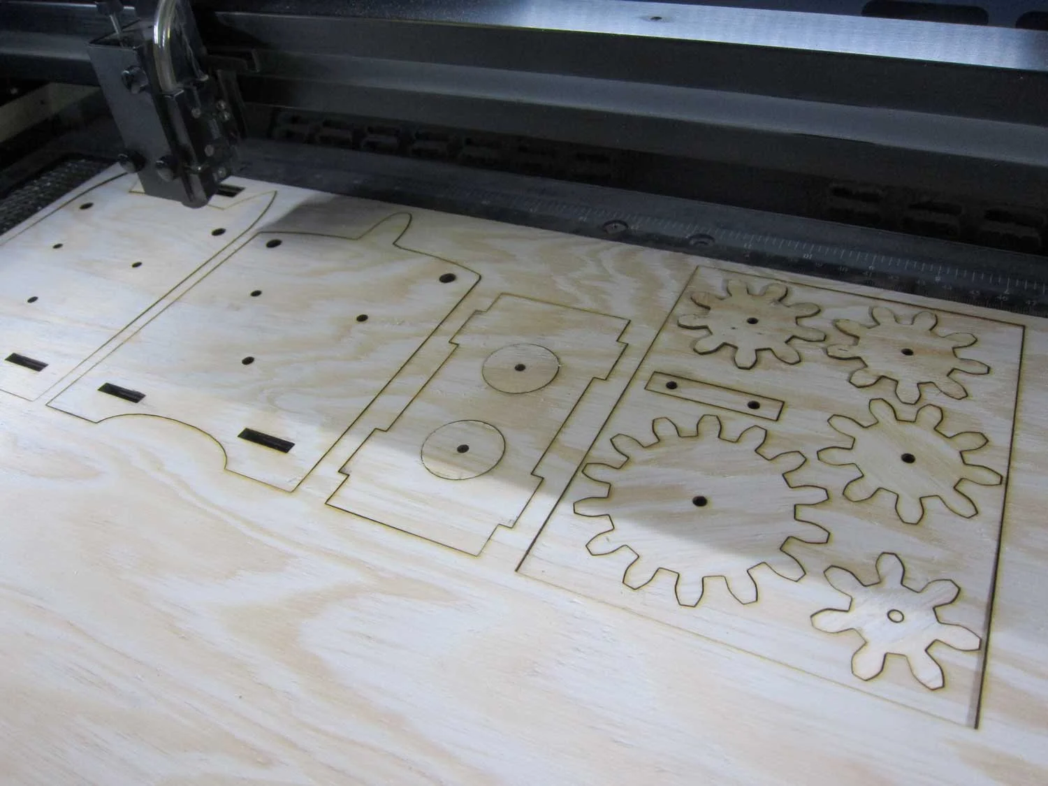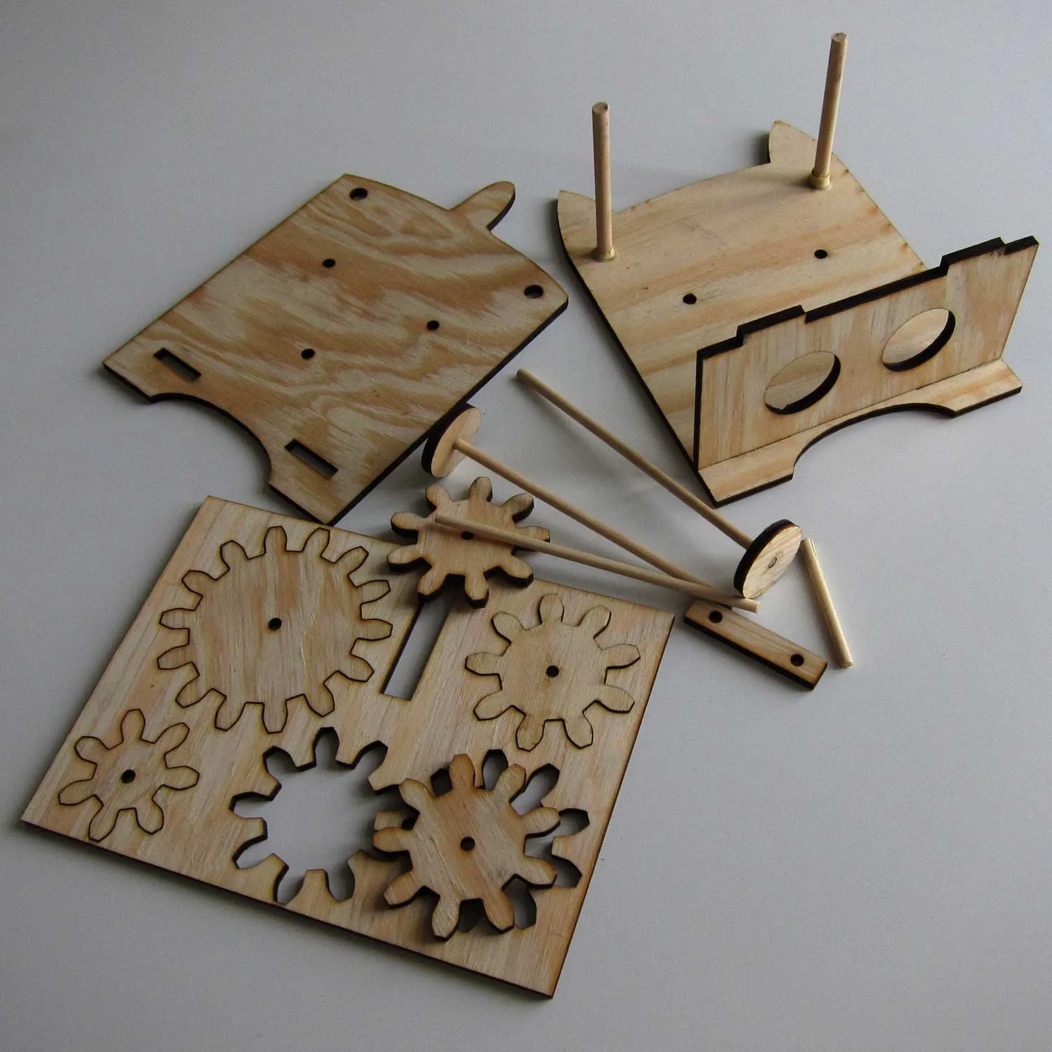 Mekanisk katt -byggesett: Settet med bærer og tannhjul er skåret ut av finer med laserskjærer, en enkel produksjonsmetode som nå har blitt alment tilgjengelig med utviklingen av nye, små maskiner og programvare. Selv om elevene får det ferdig, er det et inspirerende eksempel på hvilke teknikker de raskt kan tilegne seg og lage nesten hva som helst! Kan du printe ut en tegning, kan du i prinsippet skjære den ut.